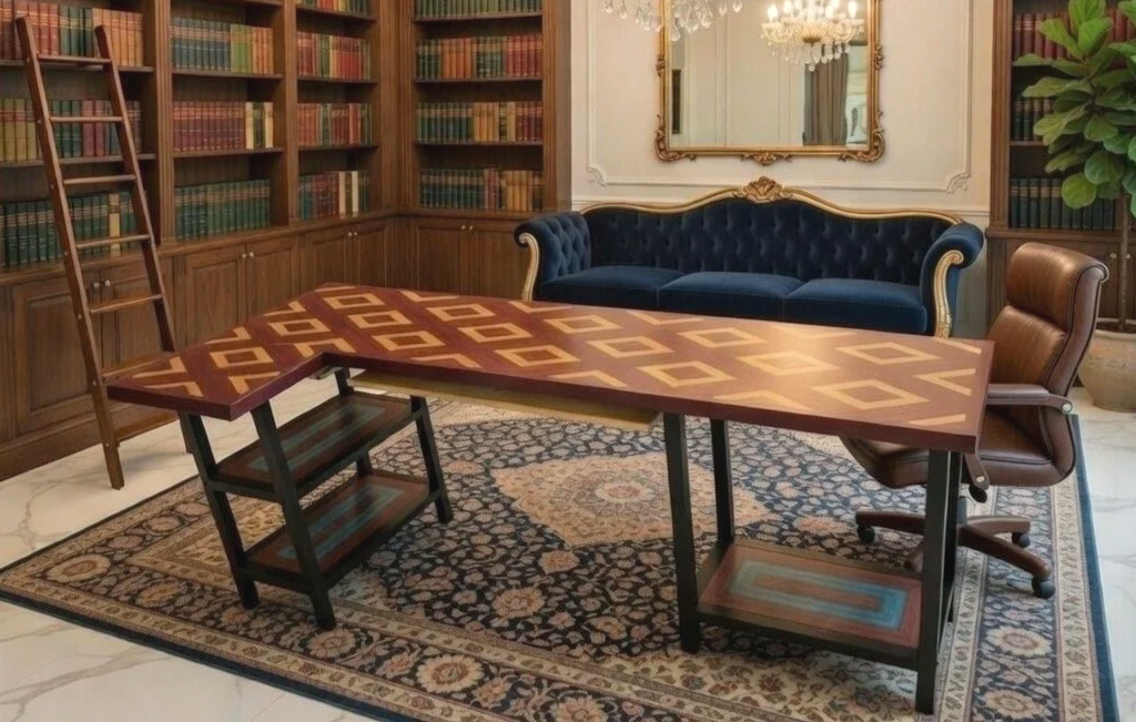 Desk made using Mahogany, Ash, and Red Oak, with blue and teal epoxy.